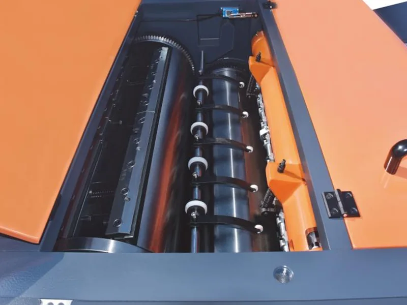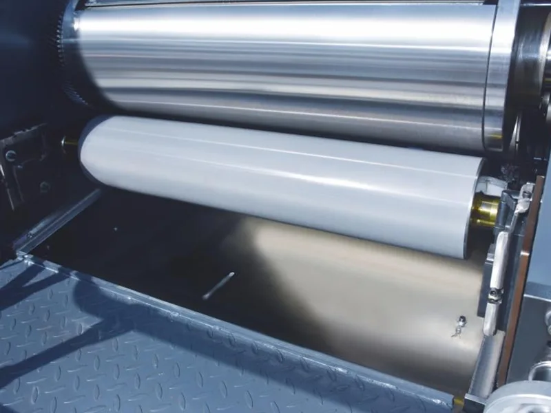 6. Rolo de impressão de grande diâmetro, balanceado dinamicamente para revestimento de óleo uniforme.